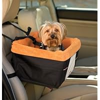 Take your dog on a comfortable roadtrip that's fun and comfortable for both of you. The polyester Kurgo Skybox Booster Seat installs quickly and easily right next to you in the front seat. It keeps your furry friend safe and secure, while still allowing him to look outside and see what's going on. He can snuggle down for a rest in the padded seat and is still within arm's reach for petting or belly-scratching. Metal supports keep the seat strong and secure. Remove the padded liner for easy washing. Attach the adjustable tether to your dog's harness for extra security. Collapses for easy storage in the trunk when not in use. The black-and-orange Skybox measures 16 x 9 x 13 inches when open. Holds up to 30 pounds.